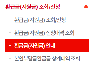 국민건강보험공단의 홈페이지에 접속하여 ‘환급금 신청’ 메뉴를 클릭합니다.