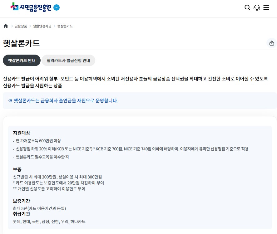 햇살론카드는 신용카드 발급이 어려운 서민을 위해 정부가 지원하는 카드입니다.